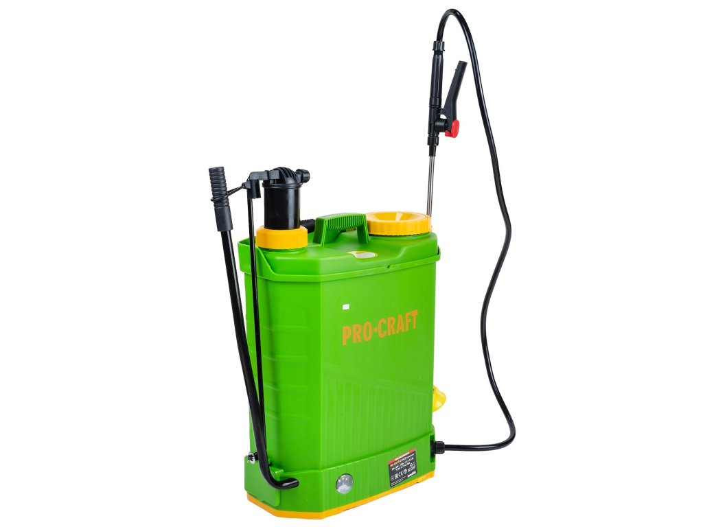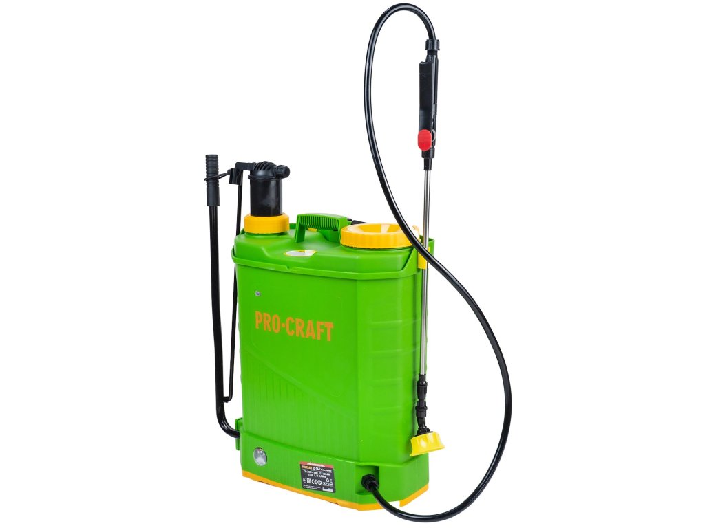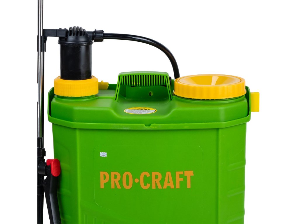 Aku postřikovač Procraft AS-16/2 kombinovaný AKU/ruční pákový je určený na postřik, rozprašování přípravků a prostředků, ošetřování rostlin a stromů, hubení škůdců a plevele, dezinfekci a čištění prostorů. Po vyprázdnění nádoby dojde k automatickému vypnutí. Spolehlivé čerpadlo s nastavitelným průtokem až 3,1 l/min a tlakem až 5,5 bar a s integrovaným kontrolním barometrem. Součástí dodávky je nabíječka a baterie umístěná bezpečně uvnitř stroje v odolném obalu proti vlhkosti. Doba provozu až 7h v závislosti na intenzitě práce a pracovním tlaku. Postřikovač má teleskopickou kovovou trubicí a je vyroben z kvalitních materiálů, které pod tlakem nepraskají. Je vybaven gumovým těsněním, které má větší odolnost než standardně dodávané silikonové těsnění. V balení jsou náhradní vyměnitelné trysky, trysky na různý roztřik, praktický zádový popruh, těsnící kroužky a komfortní spouštěcí pistole. Nádoba postřikovače je průsvitná, takže při práci vidíte objem kapaliny. Balení karton.
