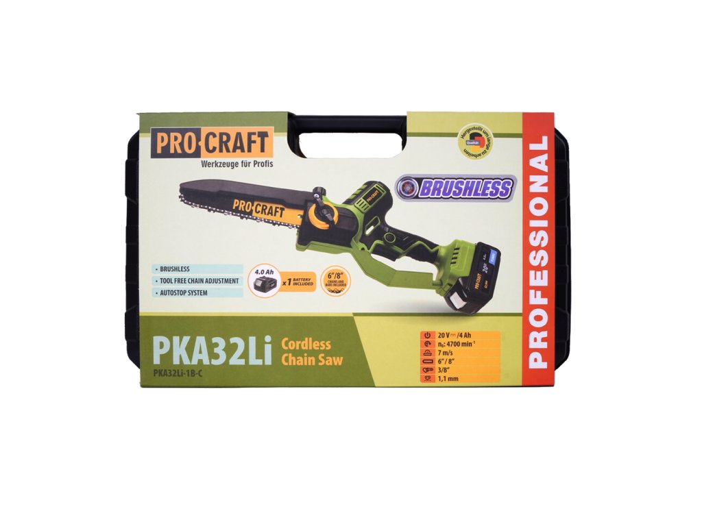 Aku ruční pilka Procraft PKA32Li je výkonná a kompaktní pila určená pro přesné řezání dřeva, větví a drobných konstrukcí. Díky bezuhlíkovému motoru, automatickému systému mazání a snadnému napínání řetězu bez použití nářadí je ideální volbou pro profesionální i domácí využití.