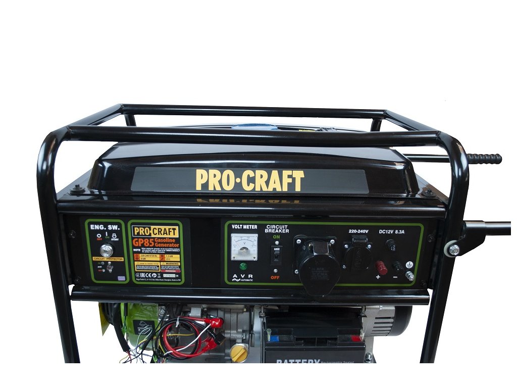 Elektrocentrála Procraft GP85 je určena k použití jako nezávislý generátor elektrického proudu při výpadcích elektřiny, jako zdroj energie při stavebnictví, v domácnosti, kde není elektrická síť dostupná. Díky vysokému výkonu umožňuje napájení nejen domácích spotřebičů, ale i spotřebičů indukčního typu. Elektrocentrála má palivovou nádrž o objemu 25l, čím zaručí dlouhý nepřetržitý provoz. Elektronický start zajišťuje rychlé spuštění benzinového motoru. Robustní ochranný rám umožňuje použití elektrocentrály v jakýkoliv podmínkách a taky usnadňuje transportování. Součástí dodávky jsou elektrická zástrčka, 2 rukojeti, 2 kola, klíč na svíčku. Balení karton. Přepětová ochrana AVR.