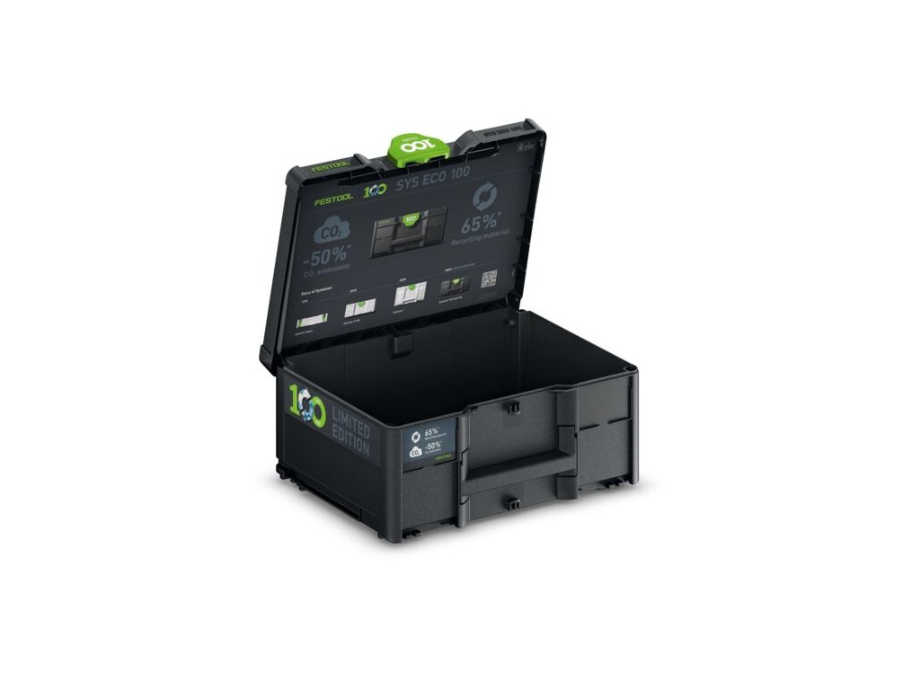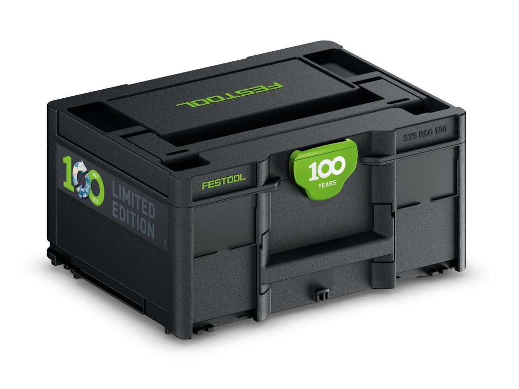 - Černá recyklovaná varianta jako limitovaná speciální edice: k 100letému výročí společnosti nabízíme Systainer³ jako černou recyklovanou variantu Systainer³ SYS ECO 100 jako limitovanou speciální edici s natištěným logem Festool 100 let na T-LOC