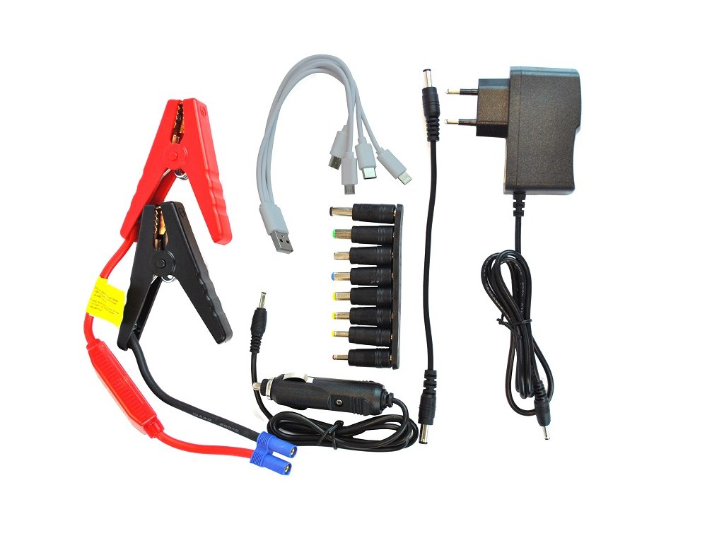 Startovací zdroj s fukcí power banky a LED svítilny. Kompaktní záložní zdroj elektrické energie pro případ nouzového statování vozidla, dobíjecí zdroj mobilního telefonu, tabletu nebo noteboku. Součástí balení je sada startovacích kabelů, redukcí a adapterů pro připojení dalších zařízení. JS-10 zvládne při plném nabití nastartovat vozidlo s el. rozvodem 12V a se zdvihovým objemem motoru do 4 000cm3.