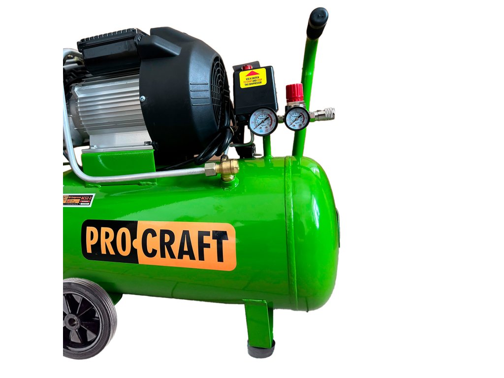 Kompresor Procraft AC52-2 je určen ke stlačení vzduchu pro provoz pneumatického nářadí, huštění pneumatik. Silný motor s výkonem 2200 W a dva písty zaručuje vysoký sací výkon až 356 l/min. Mazání olejem zvyšuje životnost kompresoru, a optický ukazatel usnadňuje kontrolu jeho stavu. Regulace výše pracovního tlaku umožňuje nastavení optimálních parametrů podle zvoleného vzduchového nářadí. Rychlospojky vývodů usnadňují a zrychlují práce. Součástí dodávky jsou přepravní kola, pryžové botky. Balení karton.