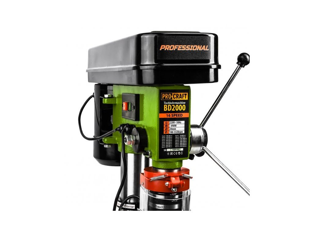 Sloupová vrtačka Procraft BD2000 je určena k vrtání do dřeva, kovu nebo plastů. Regulace otáček v 16 rychlostních stupních vrtání umožňuje nastavení optimálních parametrů při práci s různými materiály. Silný motor s výkonem 650 W a vysokých otáček až 2770 zaručuje dlouhou bezporuchovou práci. Ozubené sklíčidlo umožňuje upnutí vrtáků a stopkových nástrojů do průměru 20 mm. Možnost natáčení pracovního stolu až o 360° a naklápění do úhlu ±45°. Balení karton.