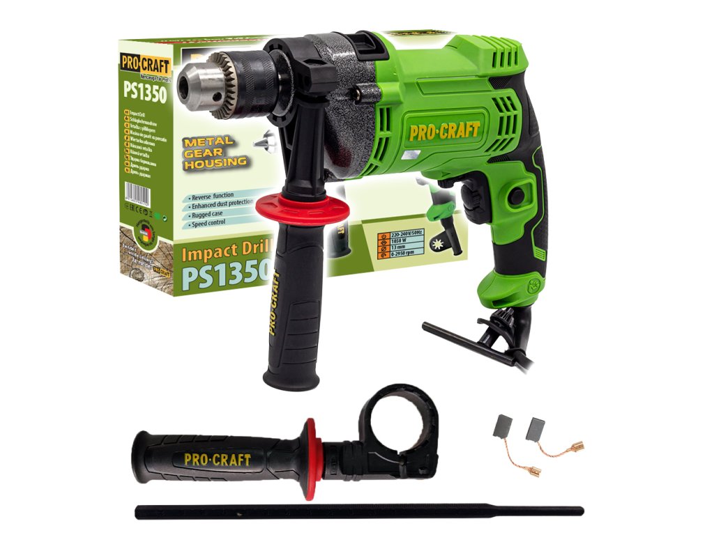Elektrické příklepové vrtačky Procraft PS1350 a PS1350M jsou určeny k vrtání do dřeva, betonu a kovu. Regulace otáček umožňuje nastavení optimálních parametrů při práci s různými materiály. Silný motor s výkonem 1050W a vysokých otáček až 2950 zaručuje dlouhou bezporuchovou práci. Funkce vrtání s příklepem usnadní a zrychlí práci s cihlou, betonem a kamenem. Rychloupínací sklíčidlo u vrtačky PS1350M umožňuje snadné a rychlé upnutí vrtáků a stopkových nástrojů do průměru 13mm. Možností změny směru otáček dovoluje povolování a utahování šroubů. Součástí dodávky jsou uhlíkové kartáče. Balení karton.